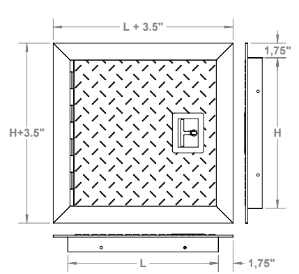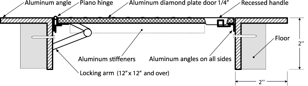 The aluminum floor hatch provides a reliable and secure access between building floors. This model is equipped with a key operated recessed handle cam latch. Can support up to 300 pounds per square foot.